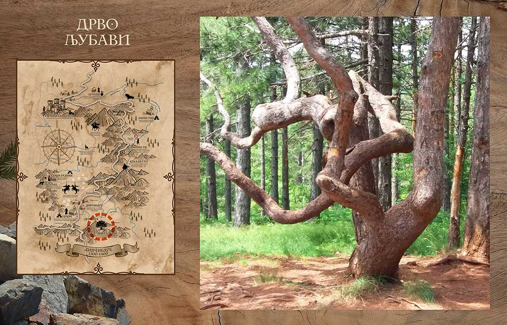 Ovo jako neobično drvo je možda jedno od najstarijih na Divčibarima. Ispod njega su vila Razvigora i kraljević Andrijaš zakleli jedno drugom u večnu ljubav, a posle njih mnogi drugi mladi, nadajući se da će ta ljubav takva i ostati. I ovo drvo je savilo svoje grane kao i da je samo u zagrljaju sa svim zaljubljenima koji mu dolaze, i čuva im uspomene.