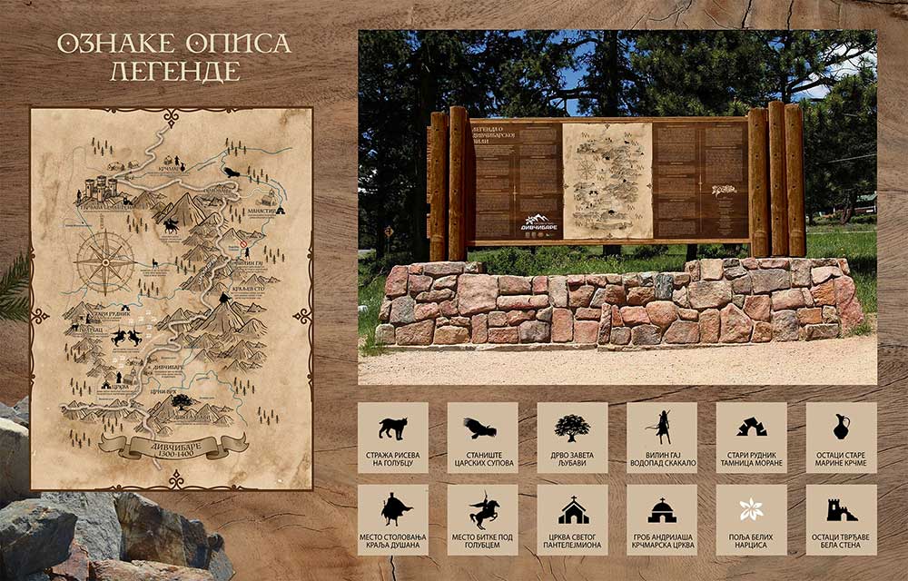 Napravljena je od materijala koji je sa Divčibara: Kamena i drveta. Na kamenim površinam je moguće sedeti zahvaljujući visini i širini, a balvani su naosači za mapu i informacija. Mapa ovek pokazuje na sebi poziciju posmatrača radi orjentacije prema drugim lokacijama.